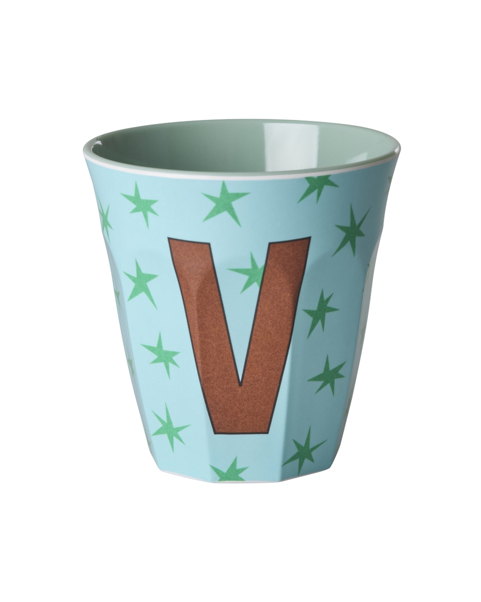 Bicchiere in melamina interno verde acqua esterno azzurro con stelline verdi e lettera V marrone