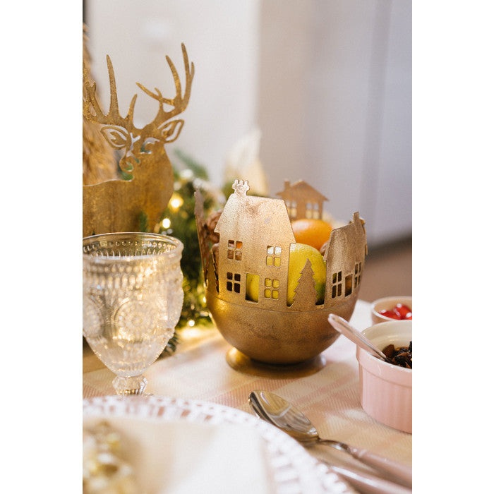 Elegante centrotavola multifunzionale in metallo dorato che combina praticità e design raffinato. Le sagome di casette creano un'atmosfera accogliente, perfetta per ospitare candele profumate o frutta fresca. La finitura dorata aggiunge un tocco di lusso a qualsiasi tavolo, mentre la struttura versatile si adatta a diversi stili di arredamento. Ideale per creare composizioni decorative che valorizzano il vostro spazio living con eleganza senza tempo.
